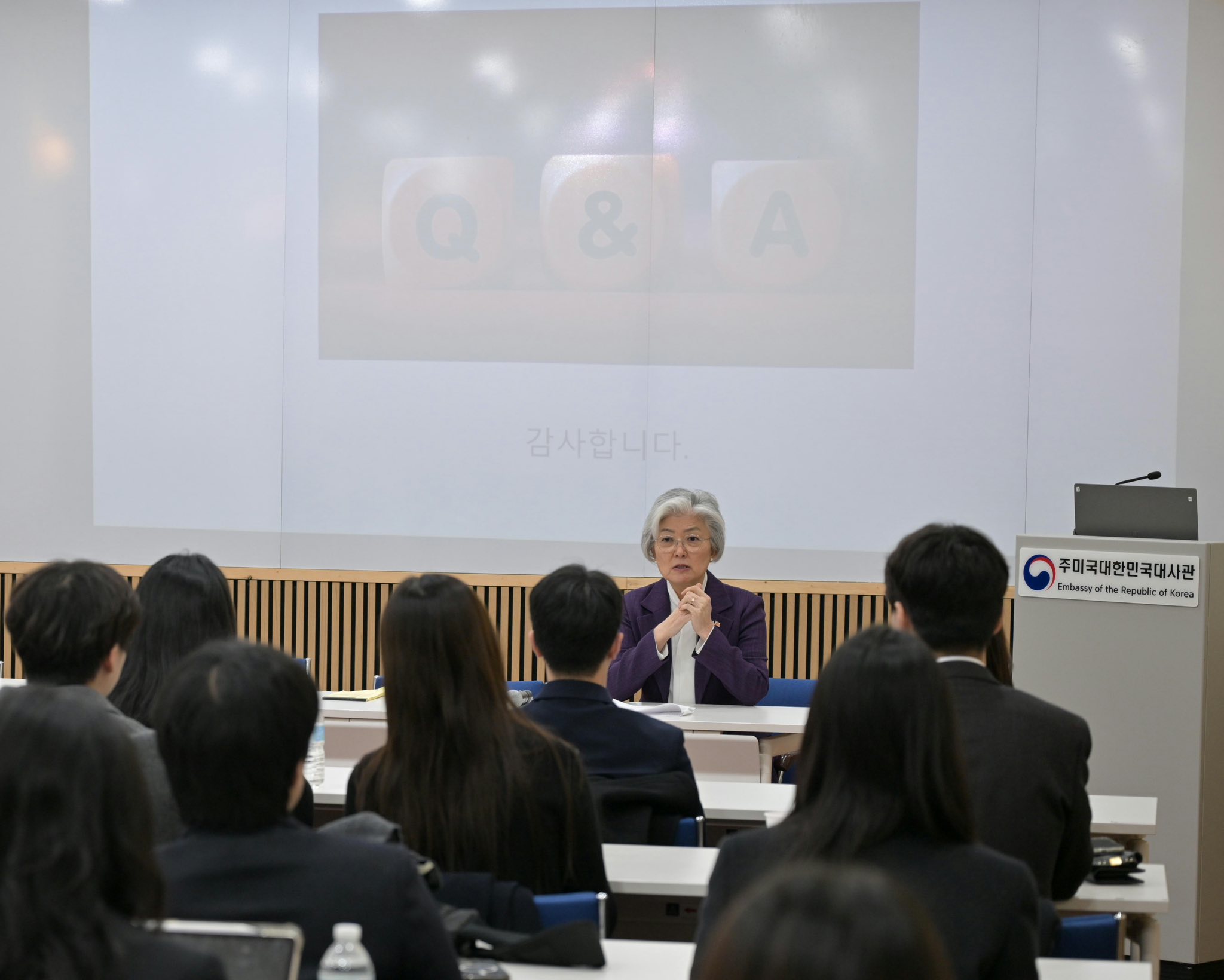 강경화 주미대사는 급변하고 있는 국제질서 속에서 우리 외교의 근간이 되는 한미동맹과 대미외교의 주안점, 대사관 및 외교관의 역할 등에 대해 학생들과 이야기를 나누는 한편, 앞으로 우리나라는 물론 한미 양국 관계를 이끌어갈 미래 세대에 대한 기대감을 표하고 격려하였습니다.